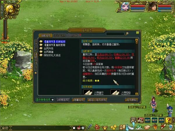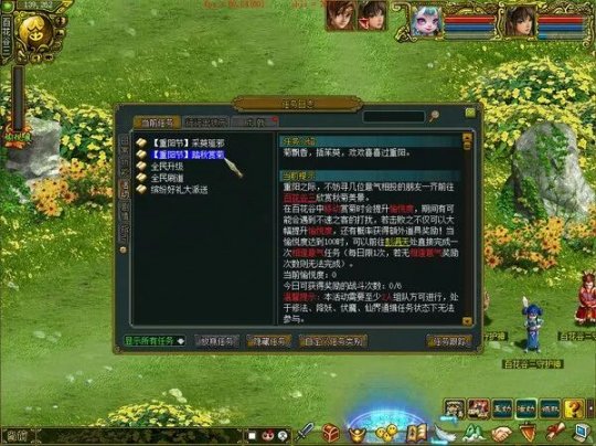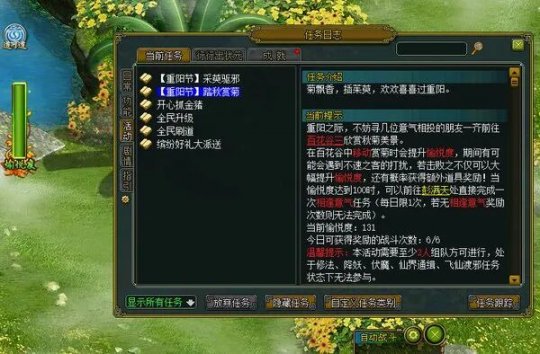 2025 · 重阳佳节 菊飘香,插茱萸,欢欢喜喜过重阳! 重阳之际,携三五好友至五系仙山采摘茱萸驱邪拿奖励吧! 重阳节 · 普通版活动合集 活动时间 2025-10-29 00:00 至 2025-10-31 23:59 活动一:“采萸驱邪?” 活动期间,角色等级≥60级的玩家可至五龙山(80,7)、终南山(24,22)、凤凰山(8,64)、乾元山(10,10)、骷髅山(23,16)附近采摘茱萸。 如果玩家有居所且有居所任务次数,将采摘的9朵茱萸交给居所管家,可以直接完成一次居所任务;没有居所或没有居所任务次数,也可以获得采萸驱邪任务奖励。完成任务除了可以获得数值奖励外,还有机会获得改头换面卡、超级粉水晶、超级圣水晶、紫气鸿蒙、心法宝典、天神护佑等随机道具。 注:该任务每日只可完成1次,且当日采集的茱萸数量将在次日0点时重置。 居所舒适度越高,提交茱萸可获得的数值奖励越丰厚。 活动二:“踏秋赏菊” 活动期间,角色等级≥60级的玩家需至少2人组队,前往百花谷三参加踏秋赏菊活动。 在百花谷移动赏菊会提升愉悦度,赏菊移动期间有可能会遇到不速之客的打扰(非野外普通遇怪战斗),击败他们可以大幅提升愉悦度,有一定概率获得改头换面卡、超级粉水晶、超级圣水晶、紫气鸿蒙、心法宝典、天神护佑等额外道具奖励。 注:每日可获得6次战斗数值奖励,超过6次后依然可以获得愉悦度奖励。 当愉悦度达到100时,如果玩家“相逢意气”任务还有可完成次数,可前往彭满天处直接通过愉悦度完成一次“相逢意气”(以此途径完成相逢意气任务每日仅限1次)。 重阳节 · 经典版活动合集 活动时间 2025-10-29 00:00 至 2025-10-31 23:59 活动一:“采萸驱邪” 活动期间,角色等级≥60级的玩家将自动创建任务【重阳节】采萸驱邪。 根据任务指引玩家可至五龙山、终南山、凤凰山、乾元山、骷髅山附近采摘茱萸。 如果玩家有居所且有居所任务次数,可将采摘的9朵茱萸交给居所管家,可直接完成一次居所任务;没有居所或没有居所任务次数,也可以获得采萸驱邪的活动奖励。完成任务除丰厚的数值奖励外,还将有机会获得随机道具奖励。 注:该任务每日只可完成1次,且当日采集的茱萸数量将在次日0点时重置。 居所舒适度越高,提交茱萸可获得的数值奖励越丰厚。 活动二:“踏秋赏菊” 活动期间,角色等级≥60级的玩家需至少2人组队,前往百花谷三参加踏秋赏菊活动; 在百花谷移动赏菊会提升愉悦度,赏菊移动期间有可能会遇到不速之客的打扰(非野外普通遇怪战斗),击败他们可以大幅提升愉悦度,有一定概率额外获得随机道具奖励。 注:每日可获得6次战斗数值奖励,超过6次后依然可以获得愉悦度奖励。 当愉悦度达到100时,如果玩家“相逢意气”任务还有可完成次数,可前往彭满天处直接通过愉悦度完成一次“相逢意气”(以此途径完成相逢意气任务每日仅限1次)。 重阳节 · 时间版活动合集 活动时间 2025-10-29 00:00 至 2025-10-31 23:59 活动一:“采萸驱邪” 在活动期间,玩家可至五龙山(80,7)、终南山(24,22)、凤凰山(8,64)、乾元山(10,10)、骷髅山(23,16)附近采摘茱萸; 如果玩家今日还有居所任务次数,可采摘9朵茱萸交给居所管家,可直接完成一次居所任务。没有居所任务次的道友,也可以获得采摘茱萸的活动奖励。完成任务除数值奖励外还将有机会获得特级晶石、特级灵石、超级圣水晶、超级粉水晶等随机道具奖励。 注:该任务每日只可完成1次,且当日采集的茱萸数量将在次日0点时重置。 活动二:“踏秋赏菊” 活动期间,角色等级≥60级玩家需至少2人组队参加踏秋赏菊活动。 在百花谷移动赏菊,会提升愉悦度。赏菊移动期间有可能会遇到不速之客的打扰(非野外普通遇怪战斗),击败他们可以大幅提升愉悦度,有一定概率获得特级晶石、特级灵石、超级圣水晶、超级粉水晶等额外道具奖励(每日可获得6次战斗数值奖励,超过6次后依然可以获得愉悦度)。 当愉悦度达到100时,如果玩家“相逢意气”任务还有可完成次数,可前往彭满天处直接通过愉悦度完成一次“相逢意气”(以此途径完成相逢意气任务每日仅限1次)。 重阳节 · 情怀版活动合集 活动时间 2025-10-29 00:00 至 2025-10-31 23:59 活动一:“采萸登高” 活动期间,真身等级≥40级的玩家和三五好友至“五龙山”,“终南山”,“凤凰山”,“乾元山”,“骷髅山”,采摘茱萸。 采摘茱萸有概率进入战斗,战斗完成后除丰厚的数值奖励外,还将有机会获得随机道具奖励。 玩家可选择提交“老酒”来采摘茱萸,使用老酒后采摘可获得双倍数值奖励(只有队长获得双倍奖励),每日最多可获得20次奖励。 活动二:“登高大比拼” 活动期间,玩家们可在天墉城处看到“重阳魔邪”,只可在三线进行挑战。 玩家每日可免费挑战三次重阳魔邪,也可花费200万文或100元宝增加挑战次数。 队伍的等级均达到100级以上可以参与挑战,接住重阳魔邪20回合的招式,并尽力反击,使其失血多的队伍将会进入排名,当日排名前5的队伍每人将获得限时30天称谓奖励“司寇重阳”和技能觉醒符印奖励。排名前3的队伍还有机会获得神兽精魄、变异精魄奖励。 温馨提示: 昨日已获得领奖资格或者已取得排名奖励的玩家无法重复参与; 若一名玩家参与多队且进入名次,则取最高名次奖励领取; 前五队伍的玩家皆可获得丰厚的数值奖励,前三队伍的玩家还有几率获得神兽精魄、变异精魄奖励; 若两队玩家造成伤害相同则先完成的玩