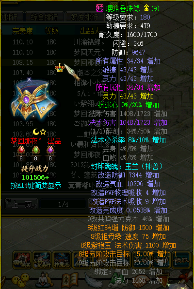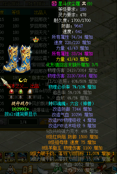 改9镶嵌8,封印神兽 紫属性1/1返照 小编有话说: 复活时恢复被破坏的娃娃和坐骑状态,同时还增加自身所有技能等级,简直神器呀。 斩仙化血刀 改9镶嵌7级 紫属性1/1风盾 小编有话说: 进入战斗随机获得物理吸收或法术吸收,日常、超级不可多得的属性。 如意玲珑甲 改9镶嵌8级 紫属性1/1灌顶 小编有话说: 释放辅助时,使任意一名友方角色精通必杀、连击提升。要求自身血量达到30W,火号木号竹熊作用比较大一点。 星斗伏尘履 改9镶嵌8级,封印神兽 紫属性1/1妙手 小编有话说: 紫属性1/1妙手,法号专属紫属性,释放师门B类技能,有几率截取目标的数个师门辅助效果化为我用。 上清逍遥冠 改9镶嵌7级 紫属性1/1识破 小编有话说: 降低目标必杀率,准确和穿透,且无视闪避效果。 斩仙化血刀 改9镶嵌8级,封印神兽 紫属性1/1醒神 小编有话说: 紫属性1/1醒神,每回合出牺牲自身法力值,解除大部分负面状态,要求法力值20W以上,算是法号专属吧,力号法力值应该很难实现吧? 太妙烟霞冠 改9镶嵌8级,封印神兽 紫属性1/1遗惠 小编有话说: 宠物倒地增加角色物理吸收和法术吸收,体玩家带这属性会不会有奇效呢? 上清逍遥冠 改9镶嵌8级,封印神兽 紫属性1/1遗惠 璎珞垂珠绦 改9镶嵌8级 紫属性1/1醉剑 小编有话说: 法号用这条紫属性除了加战力,好像没有多少用处吧。 璎珞垂珠绦 改9镶嵌8级 紫属性1/1醉剑 小编有话说: 独属于力号的属性,触发后增加精通必杀、连击的伤害。对道纹有一定要求的。 |