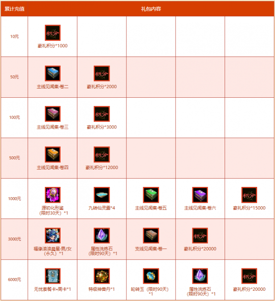 双线联运卡级轻享服“109”将于11月28日(本周五)正式开启! 在新服充值至相应额度可享受累计充值抽奖、仙道九霄、预充值大派送等多项活动福利! 接下来为大家介绍本次新服累计充值抽奖活动的详细活动内容。 累计充值礼包 累计礼包活动时间:2025年11月17日00:00:00至2025年12月14日23:59:59刮豪礼时间:2025年12月15日00:00:00至2026年01月25日23:59:59 在新服“109”累充满3000元即可换新装——福缘滚滚·晨星! 刮豪礼 1、玩家充值兑换达到50元、100元、500元、1000元、3000元、6000元六个阶段时,除累计充值礼包还可以额外获得一个刮豪礼资格;(注:必须是领取完礼包后才能获得刮豪礼资格) 2、同一帐号每阶段只能刮一次豪礼,即最多能刮六次; 3、刮豪礼有几率获得随机元灵、限定八阶坐骑光焰北斗、随机九阶坐骑、随机神兽等超级大奖。(若刮豪礼没有抽中大奖还可获得随机道具奖励,包含八卦神符、五雷令等。) 豪礼积分 1、玩家在领取每个阶段礼包时,会获得相应的豪礼积分(注:必须是领取完礼包后才能获得积分); 2、使用豪礼积分可以在活动分页参与“抽豪礼”活动,300豪礼积分抽奖一次,有概率获得随机神兽、随机变异、80级随机相性首饰等超级大奖; 3、使用豪礼积分也可以在活动分页参与“兑豪礼”活动,直接兑换道具; 4、使用豪礼积分可以兑换福袋耐久度,30豪礼积分可兑换1点耐久度的福袋,福袋可开出随机元灵等大奖; 5、豪礼积分可兑换的奖励列表: 6、豪礼积分可抽取的奖励列表: 活动规则 1、此活动仅在“109”新服开放。 2、活动开启期间,玩家累计充值达到上面的金额,可返还累计充值礼包,积分兑换不计算累计充值金额。 3、活动期间,每个阶段只能领取一次。 4、拥有“刮豪礼”的角色,如上架奇宝斋视为主动放弃返利码抽奖资格。 |