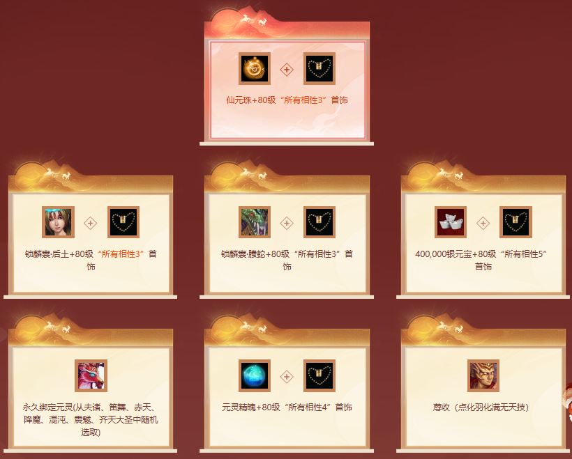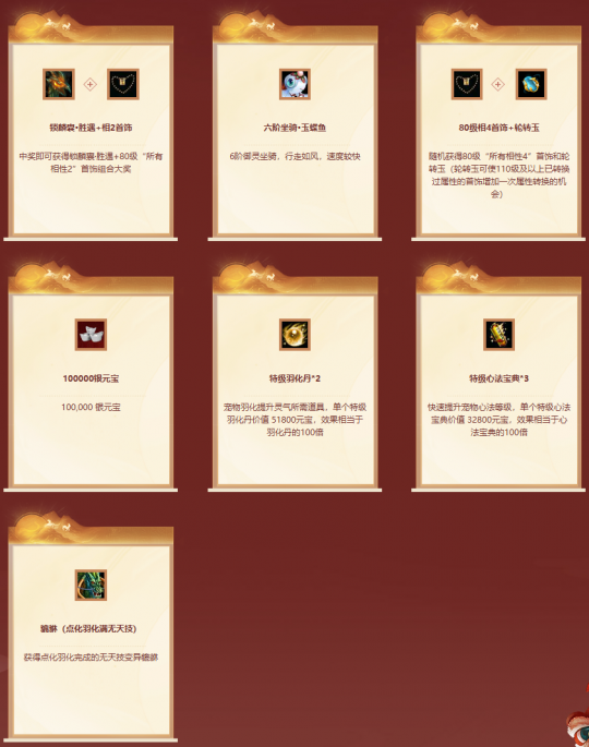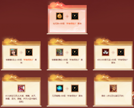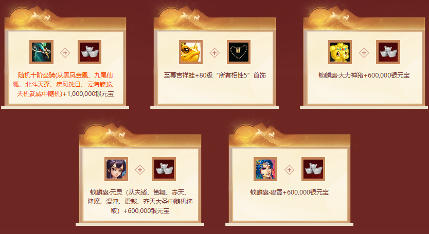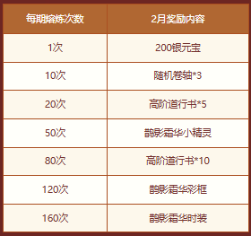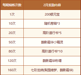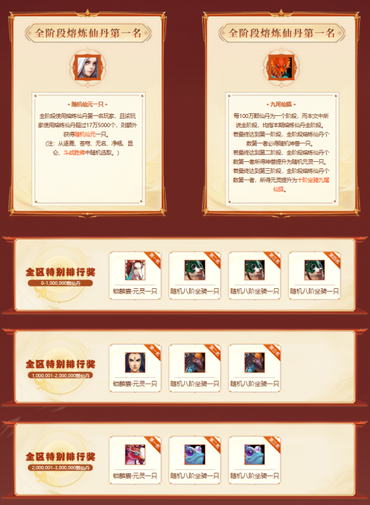 12月熔炼仙丹来袭! 本期各大奖池大焕新~ 达到第三阶段,全阶段熔炼仙丹个数第一者,所得元灵提升为十阶坐骑九尾仙狐! 锁麟囊·元灵、至尊吉祥蛙、锁麟囊·碧霄等大奖加入至尊大奖奖池! 本期累积赠礼的装扮奖励——鹊影霜华还将作为累计赠礼送出! 活动时间 2025年12月1日12:00-2025年12月31日23:59 (领奖时间截止至2026年1月3日23:59)(累积赠礼领奖时间截止至2026年1月7日23:59) 达到第三阶段后,全阶段熔炼仙丹第一名所得元灵提升为十阶坐骑九尾仙狐! 全阶段使用熔炼仙丹第一名玩家,且该玩家使用熔炼仙丹超过17万5000个,则额外获得随机仙元一只。(注:从逐鹿、苍穹、无名、净瓶、昆仑、斗战胜佛中随机选取。) 全区特别排行奖各第一名奖励全部为锁麟囊·元灵一只! 注:时装、彩框、铭牌、小精灵、流光为赠品,且限时可使用180天,可前往“问道缘大使”使用银元宝变为永久。 当月次数统计时间:2025年12月1日12:00-2025年12月31日23:59额外奖励领取时间:2025年12月1日12:00-2026年1月7日23:59 随玩家每期参与次数的不同,每个账号可看到的累积赠礼内容也不同;每期获得的累积赠礼,若玩家在活动结束时未及时领取,则通过邮件发放,请玩家在邮件倒计时结束前尽快领取。 1、举例说明 玩家A参与了1月全服熔炼仙丹80次,且领取了奖励内容:鹊影霜华铭牌及其它奖励(银元宝、随机卷轴*3、高阶道行书等),那么在2月份的全服熔炼仙丹活动中玩家看到的50次梯度奖励将变为:鹊影霜华小精灵,而其它梯度(120次、160次)对应奖励不变(因为玩家A没有达到该梯度且没有领取奖励,因此不会改变); 玩家B参与了1月全服熔炼仙丹160次,且领取了奖励内容:鹊影霜华时装(160次梯度奖励)、鹊影霜华彩框(120次梯度奖励)、鹊影霜华铭牌(50次梯度奖励)及其它奖励(银元宝、随机卷轴*3、高阶道行书等),那么在2月份的全服熔炼仙丹活动中玩家看到的(50次、120次、160次)梯度对应奖励将变为:鹊影霜华小精灵、鹊影霜华称谓、七彩龙绡(梨园绮梦、鹊影霜华); 道具介绍 ?鹊影霜华套装·男? 鹊影霜华套装·女 鹊影霜华小精灵 鹊影霜华流光 天空 地面 鹊影霜华铭牌 鹊影霜华称谓 鹊影霜华彩框 温馨提示 1、以上涉及内容为根据游戏内资料整理,部分游戏图片为测试区截图,仅供参考,如有变动,请以游戏内为准。2、全服熔炼仙丹每月熔炼仙丹获得数值奖励的次数超出250次后将不会再获得数值奖励,请各位道友注意。3、熔炼仙丹宝盒增加道具出售功能,价值低于500元宝的道具可7折出售兑换银元宝。(之前获取的但是暂时未从包裹中取出的道具也可兑换成银元宝。) |