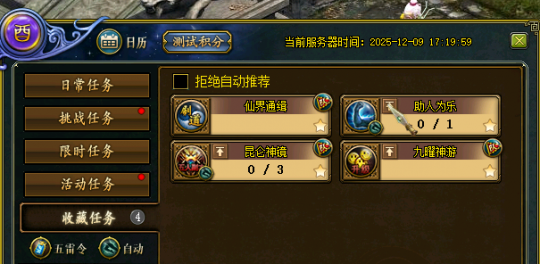 内测专区已经于12月7日晚上22:30 进行了停机维护 游戏版本已更新至1.81p.251205版本 道姐带各位道友看看最新的内测版本 都做了哪些优化? 1.81p.251205版本更新说明 001.封神斗法相关: a.增加新BOSS哪吒和敖烈; b.增加新的词条; c.增加石矶娘娘和袁洪的策略介绍。 002.开启夜行天墉活动: a.活动时间:每周一、周三、周日晚上21:00:00~21:59:59; b.活动当天可以在天墉城夏总兵处领取任务; c.活动第一阶段会在天墉城出现许多准备祸乱天墉城的不法之徒,战胜或生擒可以获得天墉城功绩值,功绩值前10%的玩家可以参与后续第二阶段活动; d.可以通过时辰系统获得活动专属的运势。 003.【仅内测】开启二十周年庆活动测试; a.活动时间:2025年12月08日00:00:00?至12月21日23:59:59; b.周年庆有如下活动:【周年庆】寻梦铸兵、【周年庆】时光故事、【周年庆】重温旧梦(包含5个子活动)、【周年庆】五行归源、【周年庆】仙山驰骋、【周年庆】七福周签、【周年庆】浮生重临。 (图片源自测试区组) 004.五脉争锋相关调整: a.增加末尾门派联盟功能,上期第四、第五名门派在本期将会一同战斗; b.末尾门派增加绝地反击效果,积分垫底时,属性大幅提升。 005.【仅内测】炼魔之阵增加新BOSS——天魔·黑凤、天魔·幽魂,替换天魔·瘟厄和天魔·秽垢。 006.瑶池演武相关: a.瑶池演武排名规则调整为:每次挑战成功会获得瑶池演武排名积分,挑战失败则会失去积分; b.增加跨服瑶池演武活动。 (图片源自测试区组) 007.开启月活动云游周天。 008.增加战魂幻形镜道具: a.持镜者可幻形成本系分支及性别对应的任意过往低于自身等级套装的战袍形象; b.商城彩饰装扮切页上架战魂幻形镜,出售时间至2025-12-30?23:59:59。 (图片源自测试区组) 009.【仅内测】测试积分相关调整: a.测试积分增加第5个宝箱,达到350测试积分可领取比第4个宝箱更多的可交易银元宝; b.升级和刷道的测试积分降为25; c.浮生传记积分的分类调整为“日常任务”。 (图片源自测试区组) 010.【仅内测】内测专区增加2个新法宝产出,法宝为:玄黄宝塔、三宝玉如意。 (图片源自测试区组) 011.增加:星府试炼、阵营任务、入圣局支持使用五雷令领取。 012.增加:退出界面的收藏任务切页现在有置顶功能了。 (图片源自测试区组) 013.登仙台相关调整: a.下调战胜NPC所获得的积分; b.上调PVP战斗胜利所获得的积分; c.提高触发特殊战斗的几率。 014.调整:提升仙界交易行黑市中万年仙精和玄黄母气的刷新概率。 015.调整帮派守护八卦阵规则,消灭阵眼守卫数量最多的队伍拥有优先挖取阵眼残片的资格,此资格保留一分钟。 016.调整:队长领取悬赏BOSS任务时,会尝试给全队非暂离角色领取相同星级的任务,切换任务模式时也会同步切换。 017.调整:现在怒海凶灵BOSS的门派会在金、木、水、火、土五种新门派中随机。 018.调整:仙元技能的精气可以使用游戏币补充了。 019.调整七日签到奖励,去除限时的法宝、宠物、坐骑、首饰、时装和铭牌奖励。 020.调整:移除主线剧情战斗的死亡惩罚,同时允许真·守护参与战斗。 021.调整时辰系统,改为每两小时一个时辰。 022.【见面会反馈】调整:宠物羽化变身开放吉祥鼠、鸿运牛、宏图兔、聚宝龙系列宠物的形象。 023.调整:在商店购买物品若同时消耗两种货币,不会切换玩家的货币消耗模式。 024.调整:在摆摊购买平台批量购买不可叠加道具时,不再需要预留过多的包裹,现在会在包裹满时停止购买。 025.调整:进行技能降级时,一次最多降低10级。 026.调整:现在师门贡献度兑换的五行精粹会掉入珍宝匣。 027.调整:奇宝斋试用时可查看珍宝匣中的道具。 028.调整跨服排位赛界面胜场的显示方式。 029.调整观战中心直播和录像规则。 030.调整:跨服排位赛精选比赛界面,可以拖入玩家名片进行搜索了。 031.调整:本月道行记录和周活跃记录界面在过图及进入战斗时不关闭。 032.调整:使用游戏内置的自由截图时会自动保存至剪贴板。 (图片源自测试区组) 033.调整:化身的友好度的悬浮提示中增加该化身的交情数据。 (图片源自测试区组) 034.调整:角色属性界面增加土相性点数会影响孔雀技能伤害的相关描述。 (图片源自测试区组) 035.调整无忧套餐卡临近到期时的提示。 036.调整:开始自动任务时现在有宠物训练营可补缴的提醒了。 037.【仅内测】调整:内测专区关闭勇闯万妖窟活动。 1.803p.251205版本更新说明 001.调整:降低自动任务时剧本播放的速度。 002.调整:绑定密保和手机认证的每周奖励,改为绑定后即可领取,每个账号仅可获得1次。 003.调整:封印了神兽的装备不再能被拆分。 004.调整:灵宠转生任务不再能提交封印有宠物的法宝。 005.调整:未服用七宝玄灵液的宠物,悬浮信息中不再显示七宝玄灵液未生效。 006.调整英雄会雕像站位,减少遮挡。 007.修正居所的家具回收后无法一键摆放恢复的问题。 008.修正奇宝斋订单中妆匣界面的时装悬浮形象与预览效果不一致的问题。 009.修正有其他年费会员玩家靠近时,年费会员界面会自动置顶的问题。 |