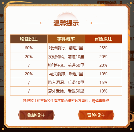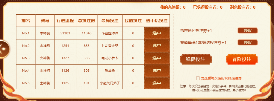 五道神骏踏破虚空而至——金、木、水、火、土,五行之力化作五匹天驹,将在新服“2026”展开一场激烈的“五骏争雄”之战! 为你心仪的赛马投注,活动结束时五匹赛马各自投注数最高的玩家可获得排名大奖——大疆DJI Neo 2 畅飞套装。 另外如果你投注的赛马活动结束时排名第一,其投注的玩家按投注比例瓜分300万银元宝。 投注的赛马前进里程达到对应里程即可领取幸运奖券,中奖的道友将独得8800点卡! 活动时间 2025年12月29日 00:00 - 2026年01月12日 12:00 活动地址 活动玩法 完成以下任务【获取投注券】: 在新区“2026”完成绑定角色可获得1张投注券; 在新服充值每满100元即可领取1张投注券,不设上限。 消耗投注券为你心仪的赛马投注,可选择稳健投注或冒险投注进行投注。(投注券剩余数量≥10张时,可勾选使用10连投注。) 稳健投注和冒险投注有不同的概率触发事件,请慎重选择: 奖励一:瓜分300万银元宝 300万银元宝 获奖条件:投注总里程排名第一的赛马 分配规则:按投注比例瓜分 计算公式:个人获得 = (个人投注数 / 该马总投注数) × 3,000,000 平局处理:赛马里程相同时,按时间先后排名 奖励二:排名大奖 大疆DJI Neo 2 畅飞套装 获奖条件:每匹马投注票数最高的玩家 奖励数量:5份(每匹马1份) 平局处理:里程相同时,按时间先后排名 限制规则:单人最多获得1份,重复获奖不发放,奖励不顺延 奖励三:幸运奖券 8800点卡 触发条件:投注的赛马前进里程达到1000里、5000里后可领取奖券 获奖资格:投注该马的玩家 奖券号码:从00000到99999,随机发放,号码不重复 奖励内容:1张抽奖券,同一里程奖券不可重复获取,最多可领取两张 开奖规则:活动结束后根据五匹赛马的排名取各自的里程尾数,按名次从高到低从左往右组合出5位数为奖券开奖号码,若已领奖券中没有与开奖号码相同的号码存在,则与此数差值最小的奖券拥有者得奖;差值相同时,数字更大的一方中奖 获奖地址填写 获得实物奖励后,请在活动页面填写收货方式(姓名、手机、地址)。 地址填写时间:2025年12月29日 00:00至2026年01月15日 23:59,逾期未填写收货地址视为放弃奖励。 奖品发放规则 光宇一卡通点卡奖励将在活动结束后5个工作日内发放; 银元宝奖励将在活动结束后5个工作日内发放,在揽仙镇-一叶知秋处即可领取; 大疆无人机DJI Neo 2 畅飞套装实物奖励将在在活动结束后10个工作日内发出;发放奖励时,若玩家账号绑定的手机号与收货手机号不一致,我们会通过绑定手机联系玩家确认为本人填写,若未联系到玩家,则从活动填写地址结束后计算60天内,玩家未联系我们的,则默认玩家非本人填写,且放弃奖励不再发放; |