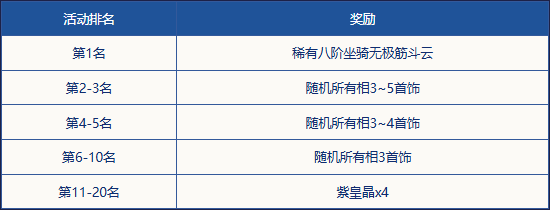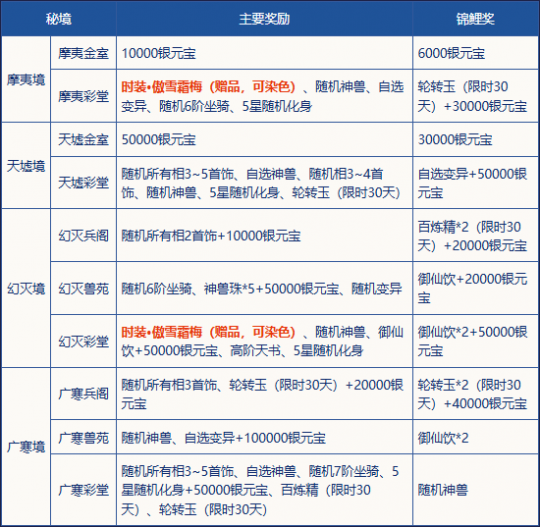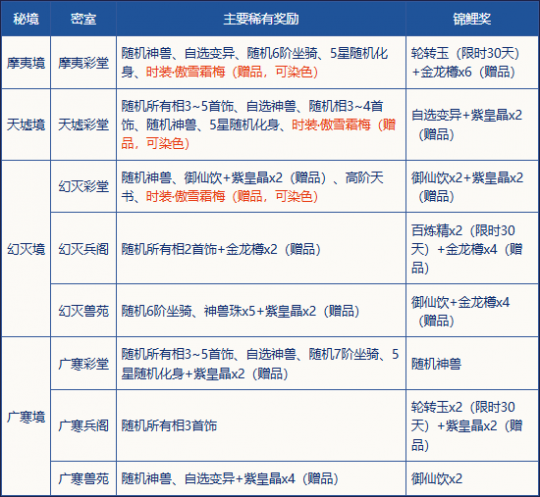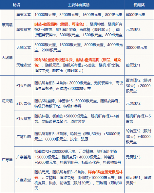 普通版、经典版、时间版【破阵探宝】活动明天来袭! 破阵之人将有机会开启千年宝库,取走镇阵之宝! 可染色稀有时装“傲雪霜梅”、八阶坐骑“筋斗云” 惊喜坐镇奖池,探得宝物就归你! 活动时间 2026-02-06 至 2026-02-22 活动奖励 符合角色等级的普通版、经典版、时间版道友前往摩夷境、天墟境、幻灭境和广寒境4处秘境探宝,即可有机会获得以下奖励: (普通版秘境探宝奖励一览,非所有奖项) (普通版破阵探宝排行榜奖励) (经典版秘境探宝奖励一览,非所有奖项) (经典版破阵探宝排行榜奖励) (时间版秘境探宝奖励一览,非所有奖项) (时间版破阵探宝排行榜奖励) 筋斗云(八阶坐骑) 御灵 精怪 傲雪霜梅(时装) |