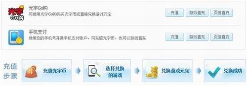 光宇Go购的游戏直充功能:玩家可在充值中心(http://pay.gyyx.cn/)选择使用光宇Go购进行游戏直充,可使用光宇Go购进行网银支付或使用余额支付。
