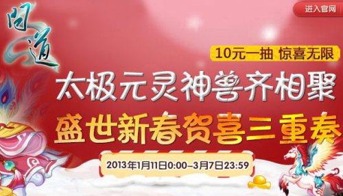 《问道》还准备了新年礼包,还有丰富多彩的抽奖活动,让道友们欢欢喜喜过大年!太极元灵神兽齐相聚 10元一抽惊喜无限,为贺新春,特开启新春充值活动,每兑换10元即可参加抽奖活动,太极元灵神兽齐相聚,盛世新春贺喜三重奏,无限惊喜,奖品等您拿! 迎1.491元灵面世版本,为贺新春,特开启新春充值活动,起每兑换10元即可参加抽奖活动,太极元灵神兽齐相聚,盛世新春贺喜三重奏,无限惊喜,奖品等您拿!