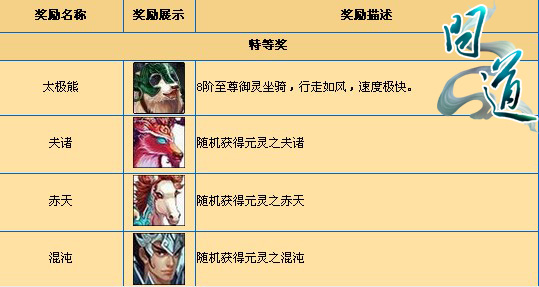 此次活动时间为2013年3月1日12:00至3月17日23:59,活动期间等级≥40级的玩家可到天墉城活动大使处购买奖券,每人购买数量不受限制,可批量购买。奖券价格为200金元宝,先到先得,不可错过哦! 购买奖券成功后,在活动时间内点击使用奖券,将有机率获得太极 元灵(赤天 、降魔、夫诸),神兽(朱雀、疆良),变异(禾雀、牡丹花),神兽精魄变异精魄,商城道具以及经验道行等奖励。如此诱人的奖品,一旦获得,寻仙渡邪必是指日可待!