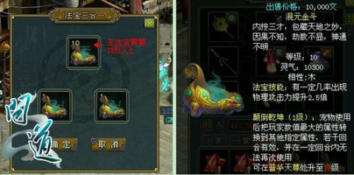 法宝融合,宝器升级,《问道》法宝三合一,为您驰骋中州,纵横四海之路注入强大生命力。获得了新的法宝技能以后就快快升级新技能吧。中州大陆依旧危机四伏,需要有志之士出手相助,包围四方和谐安宁!铮铮铁骨,迈迈豪情,拯救世界的英雄非你莫属! [编辑:魅瞳]