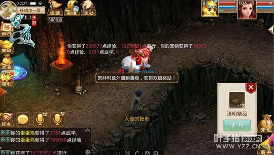 由于轩辕坟香火鼎盛,引得各处妖邪来临,驱逐这些外来的妖邪义不容辞。活动期间,所有等级大于等于30级的玩家3人组队,在完成祭拜任务后领取驱邪得宝任务,在轩辕坟战斗随机刷新的入侵妖邪即可得到丰厚的奖励,还有可能获得变异宠物。